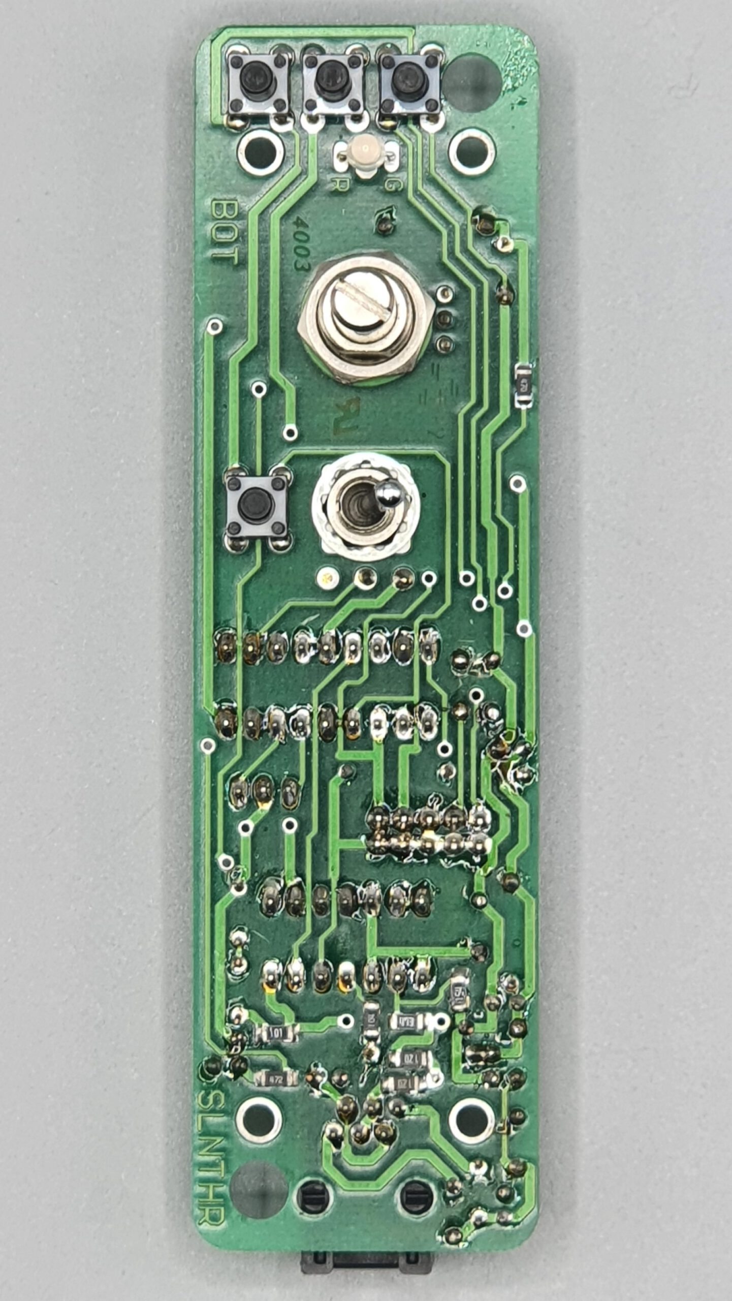 Die Platinen des SLNTHR war ebenfalls einfach gehalten. Es gab keine SMD-Bauteile und alles konnte per Hand, notfalls auch daheim zusammengelötet werden. Es gab auch einige Basteltreffen, bei denen in einer Art „Fließbandfertigung“ die Platinen Tisch für Tisch weitergegeben wurde und jeder nur einige Bauteile einlötete, dafür aber gefühlte 100 Mal am Tag…..
