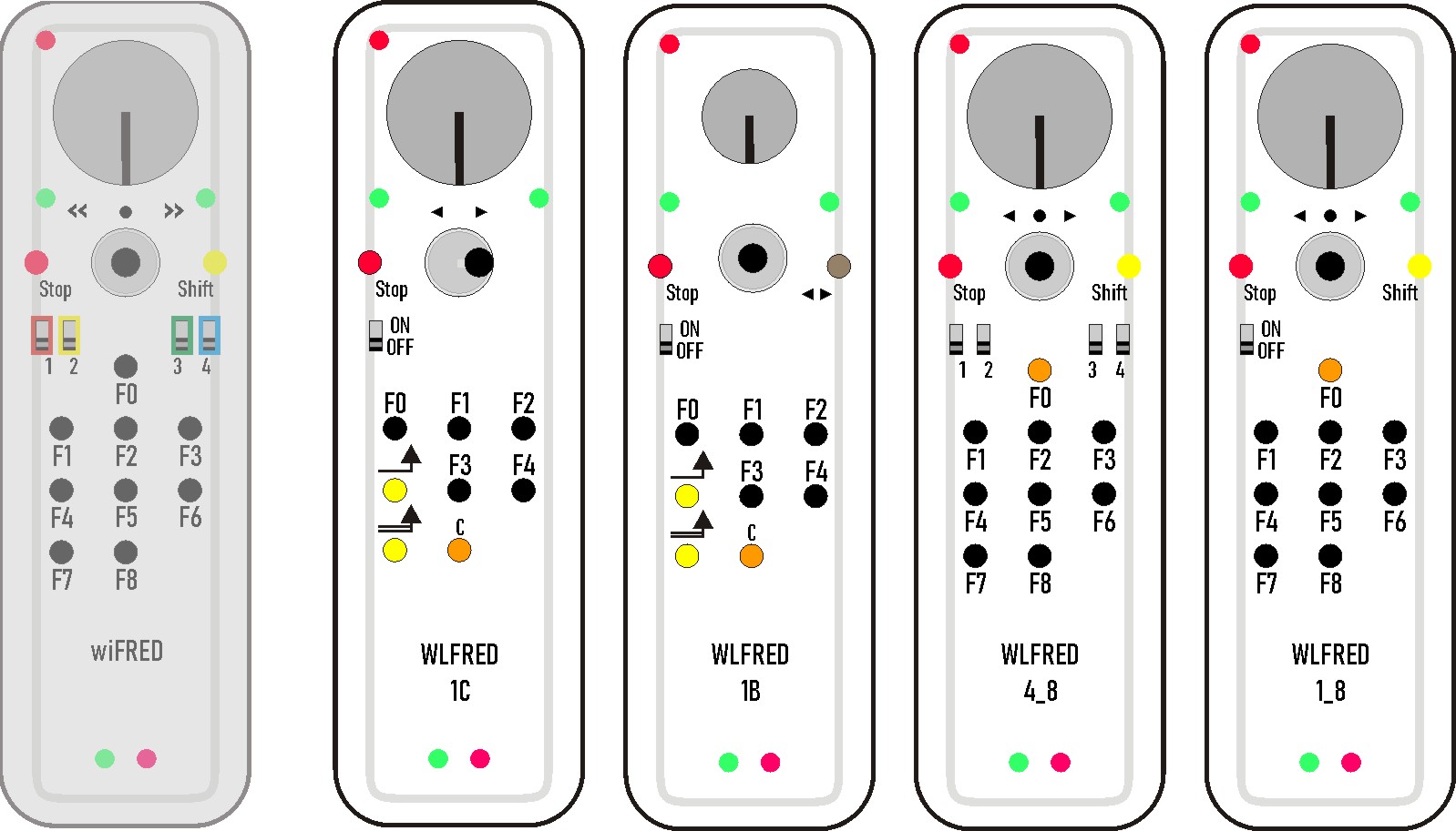 wiFRED (Restbestände Bausätze lieferbar), WLFRED 1C (Verfügbar, Sammelbestellung läuft), WLFRED 1B (Prototypenphase, verfügbarkeit zeitnah), WLFERD 4_8 (zeitnha nach Abverkauf wiFRED verfügbar, erweiterte Funktionalität), WLFRED 1_8 (Variante, ebenfalls zeitnah verfügbar)