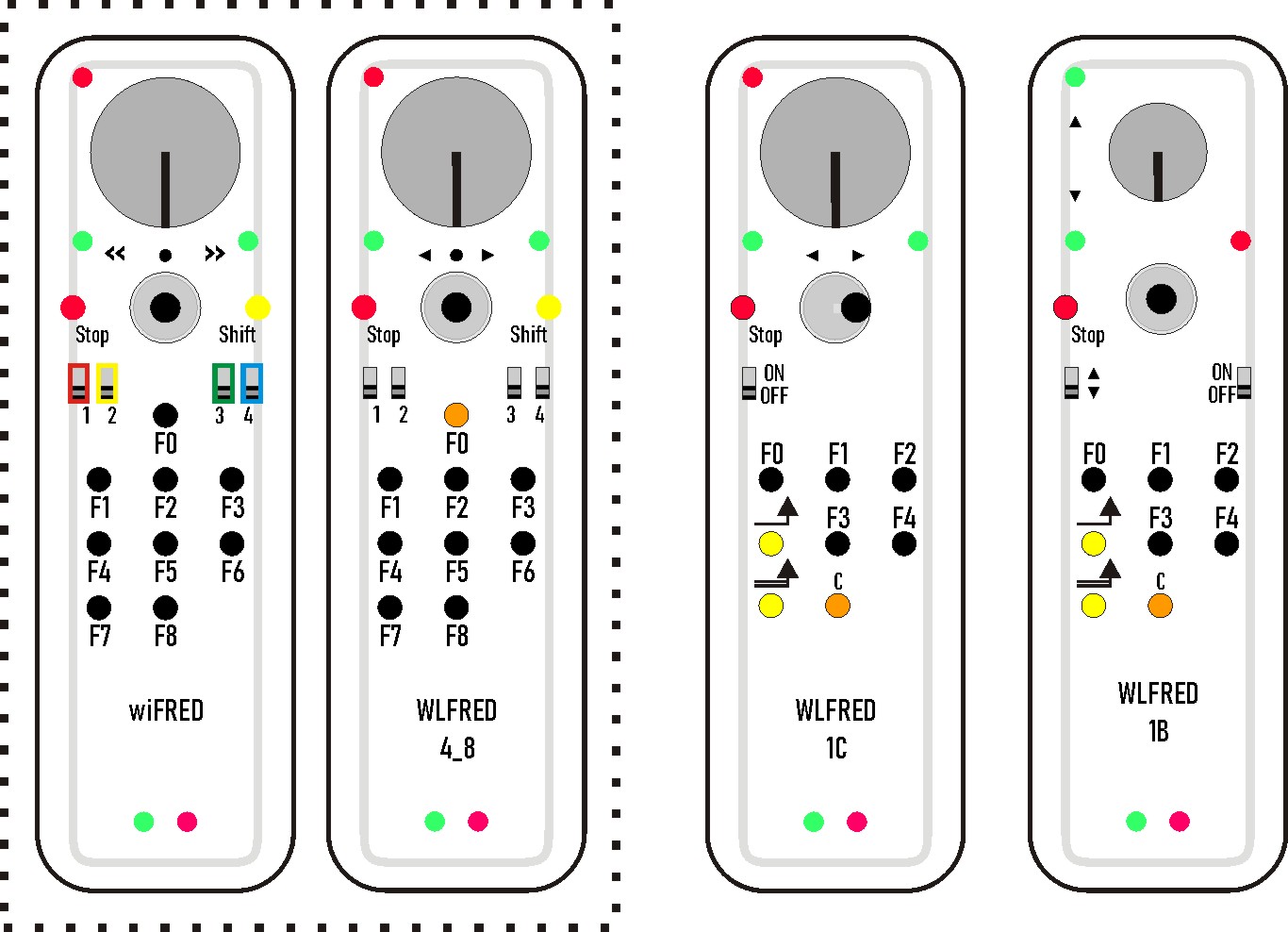 wiFRED (Restbestände Bausätze lieferbar), WLFERD 4_8 (zeitnah nach Abverkauf wiFRED verfügbar, erweiterte Funktionalität), WLFRED 1C (Verfügbar, Sammelbestellung läuft), WLFRED 1B (Prototypenphase, verfügbarkeit zeitnah)